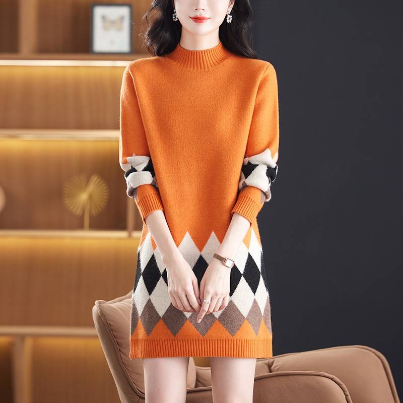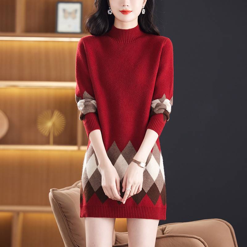 2024秋冬季新款连衣裙中长款高领上衣女遮屁股洋气高档红色毛衣裙