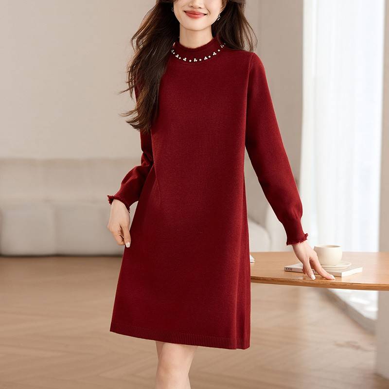 钉珠设计感本命年红色毛衣裙女秋冬2025新款中长款打底连衣裙气质