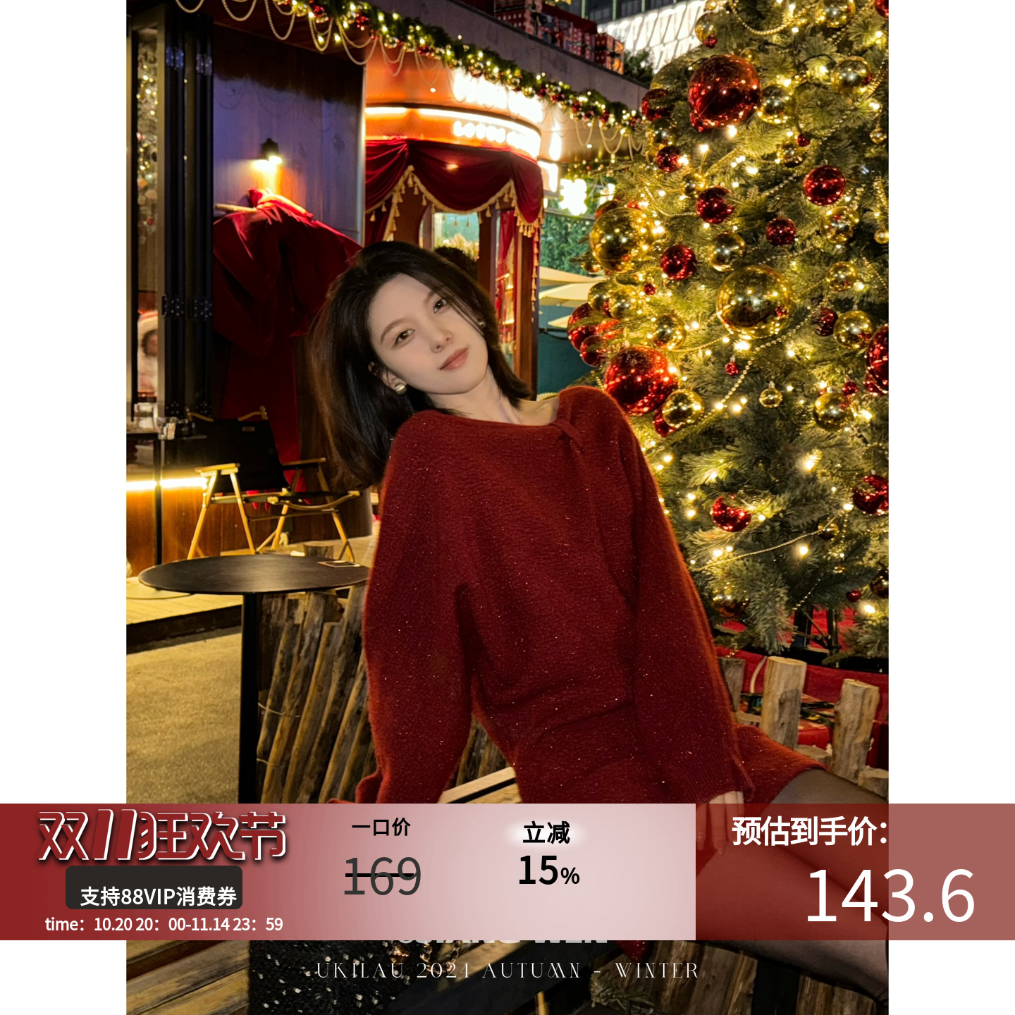 乔拉【圣诞胶片】秋冬新款U领喇叭袖鱼尾摆红色毛衣裙子时尚套装