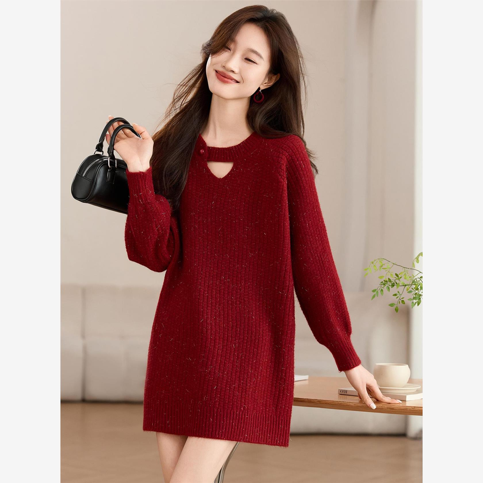 2025新款秋冬季加厚亮丝中长款宽松针织衫上衣女本命年红色毛衣裙