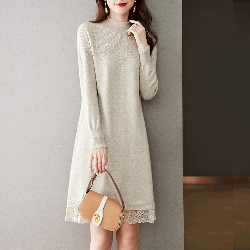 针织连衣裙女秋冬季新款高级感内搭长袖打底a字裙长款红色毛衣裙
