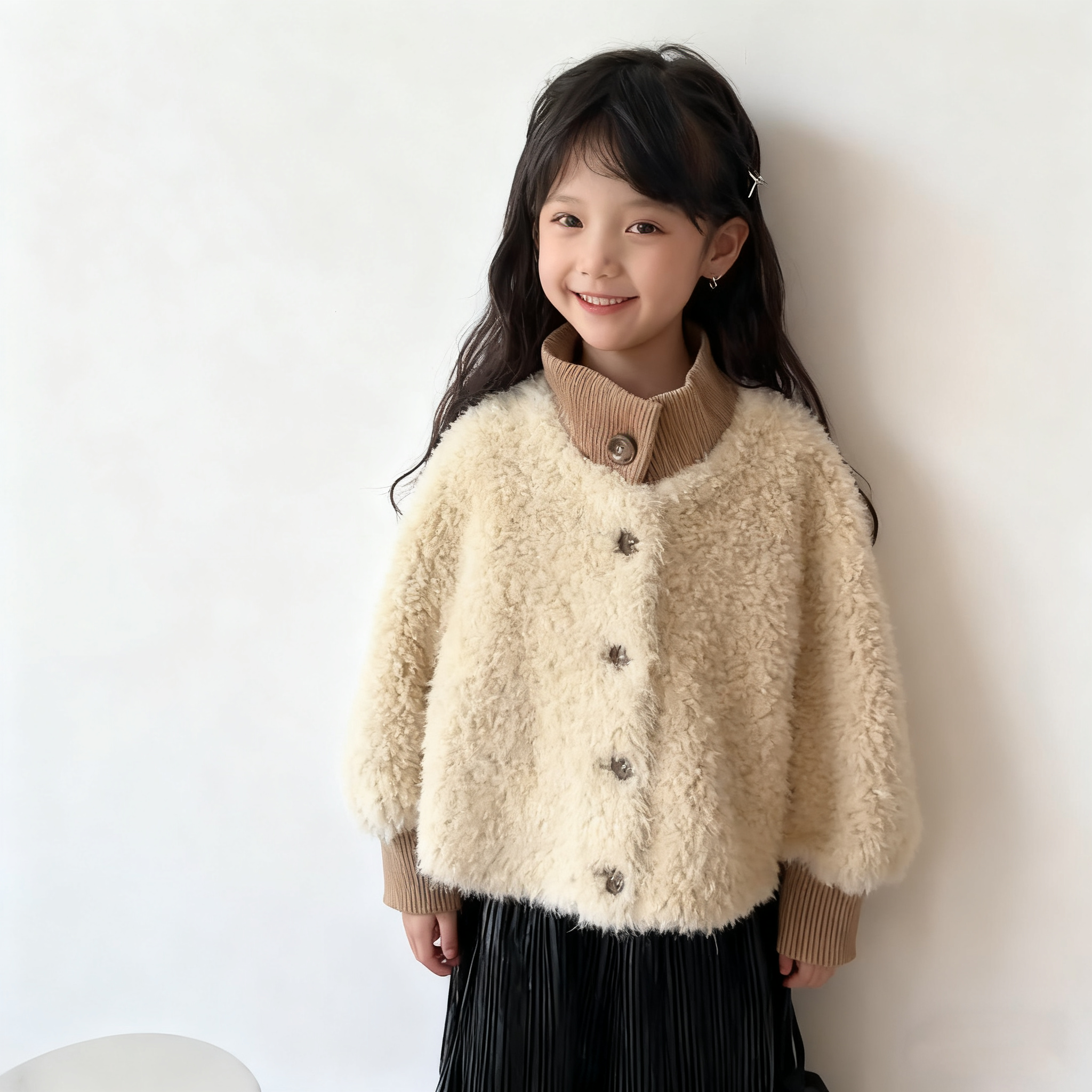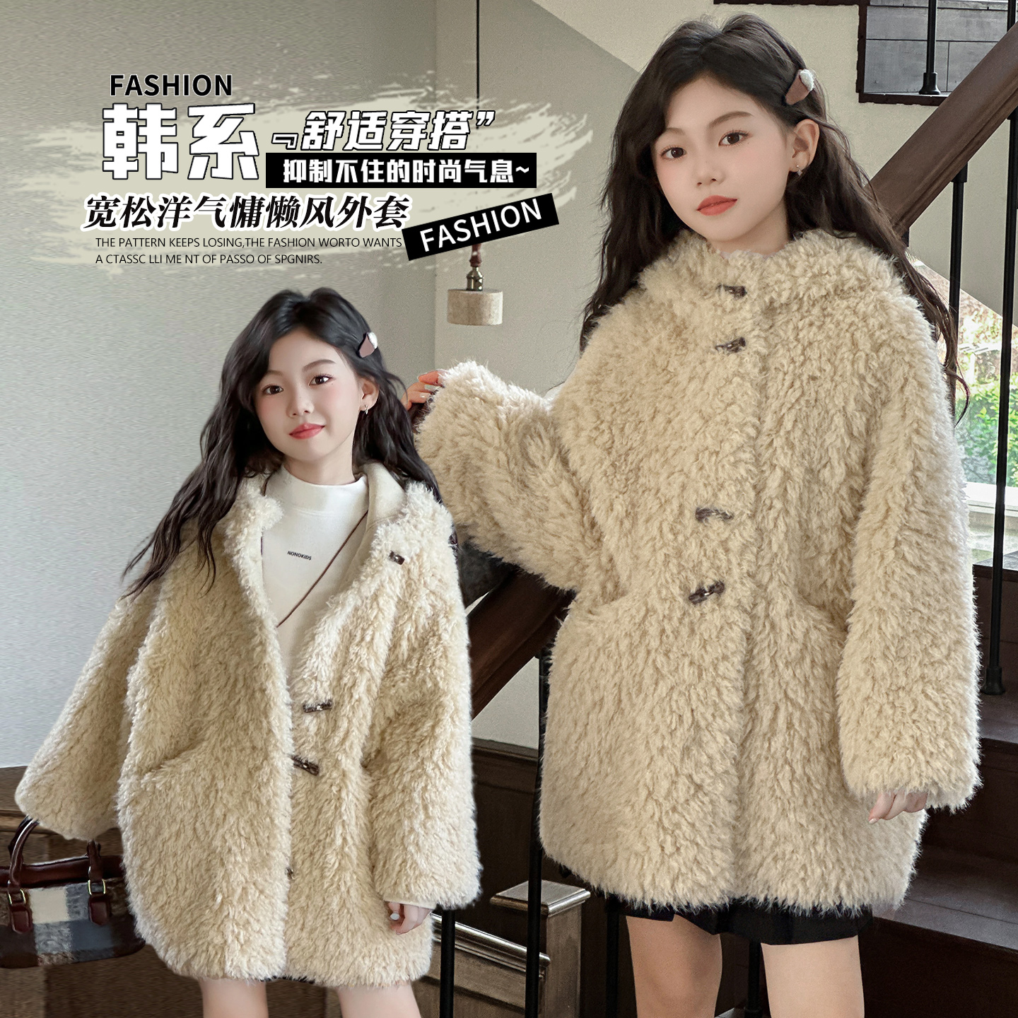 KMMO女童皮草外套2025冬季新款儿童仿羊羔毛大衣加厚加绒洋气冬装