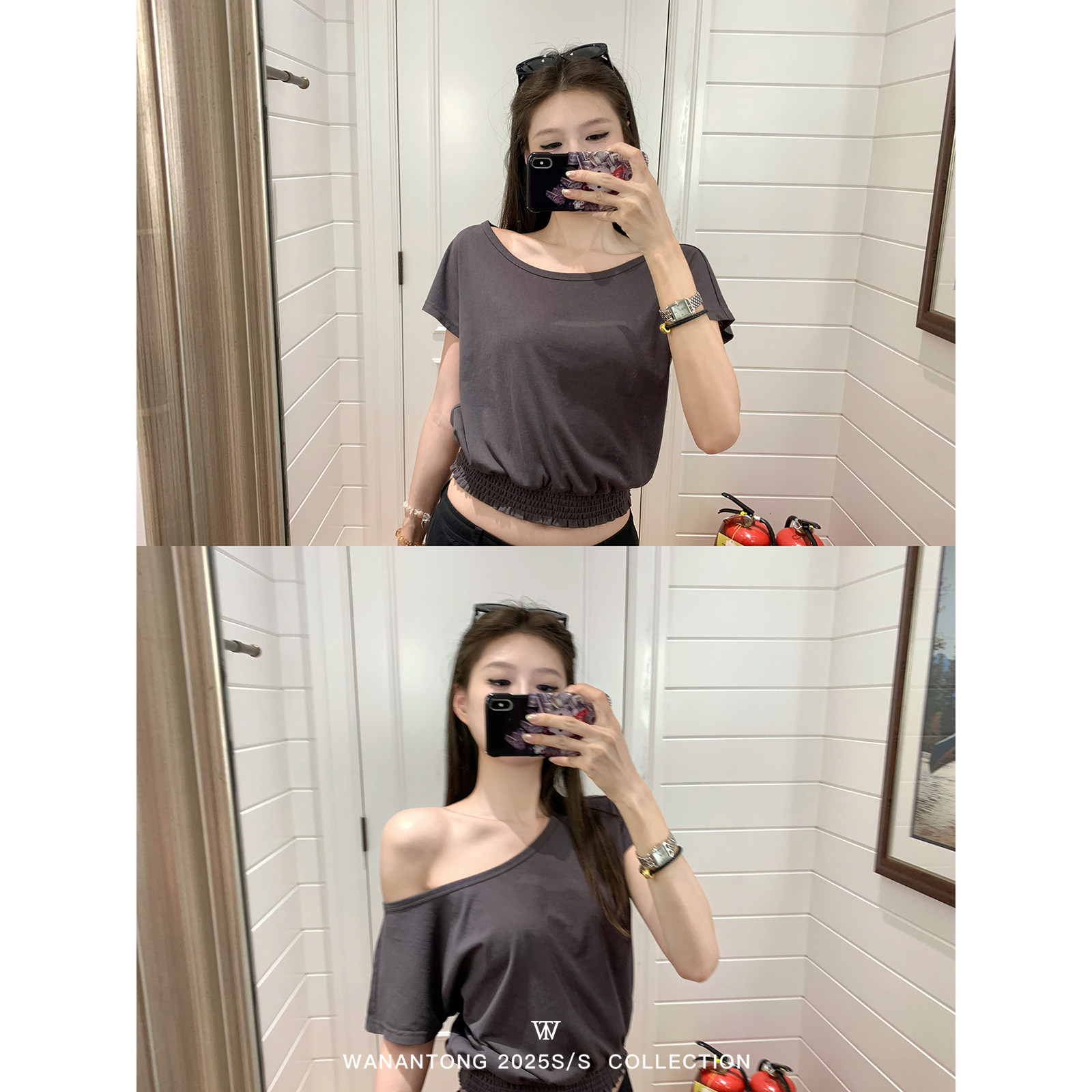 WANANTONG 日常里的小气质 姐感斜肩打揽T女夏季短袖上衣