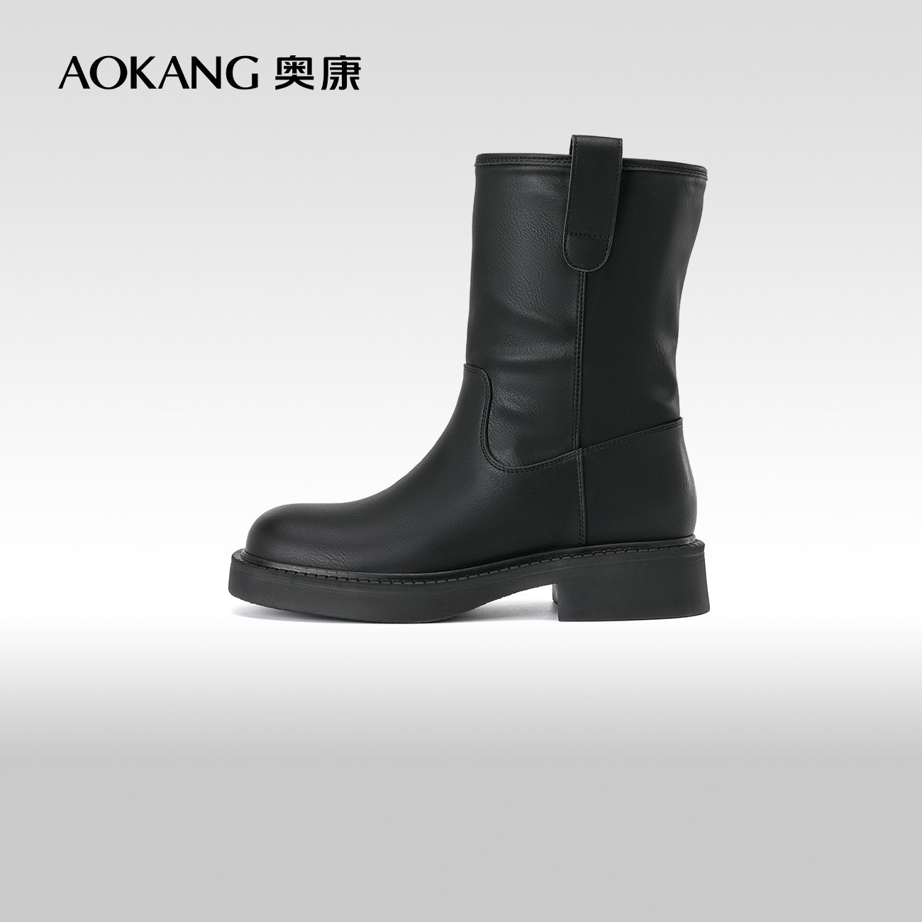 木林森女鞋2025冬季新款方跟圆头中筒靴子复古时装靴女士高跟短靴