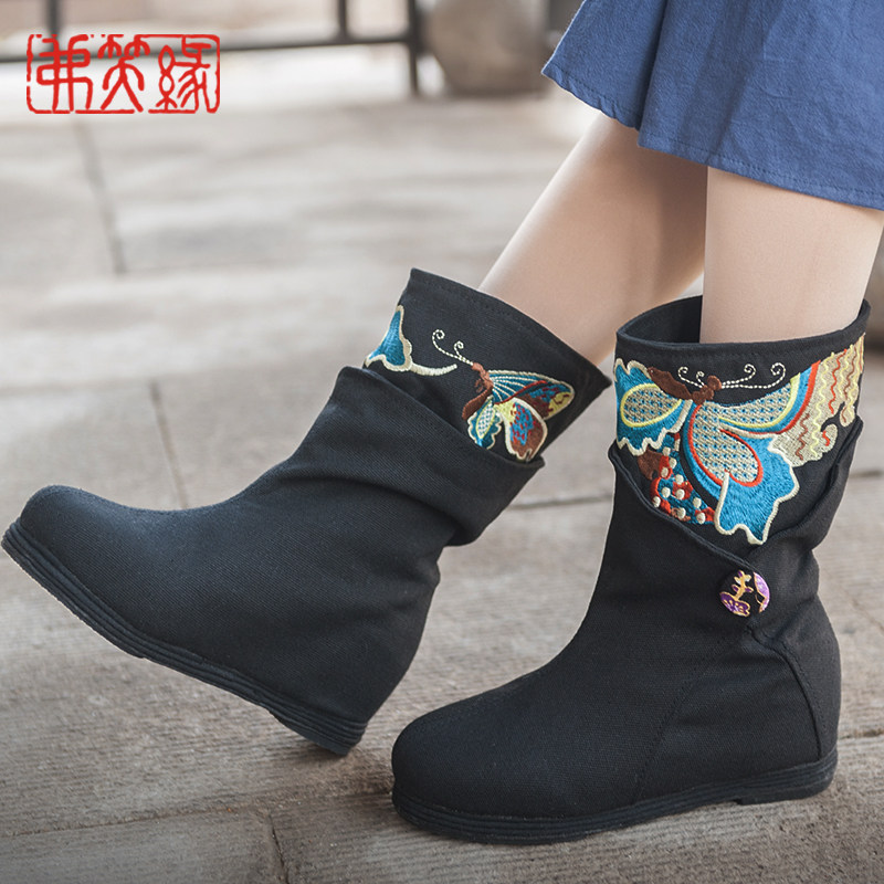 民族风鞋女千层底老北京布鞋女秋冬加绒加厚舒适一脚蹬圆头中筒靴