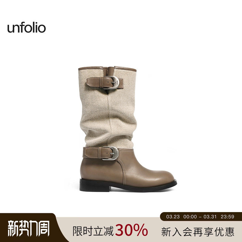 马思纯同款unfolio金属搭扣长筒堆堆靴圆头中筒骑士靴子女