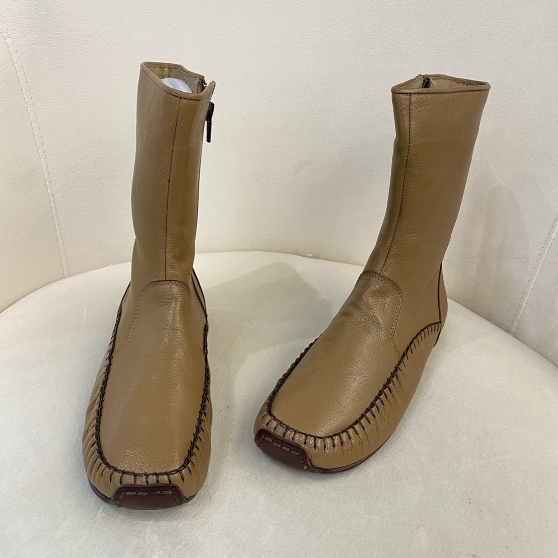 手工缝制舒适百搭高品质牛皮平底圆头中筒靴拉链女式靴子加绒单靴