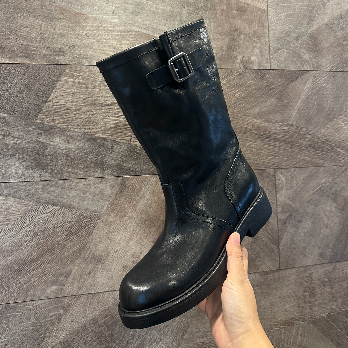 2025秋冬新款复古金属扣磨砂堆堆靴粗跟圆头中筒靴子手工真皮长靴