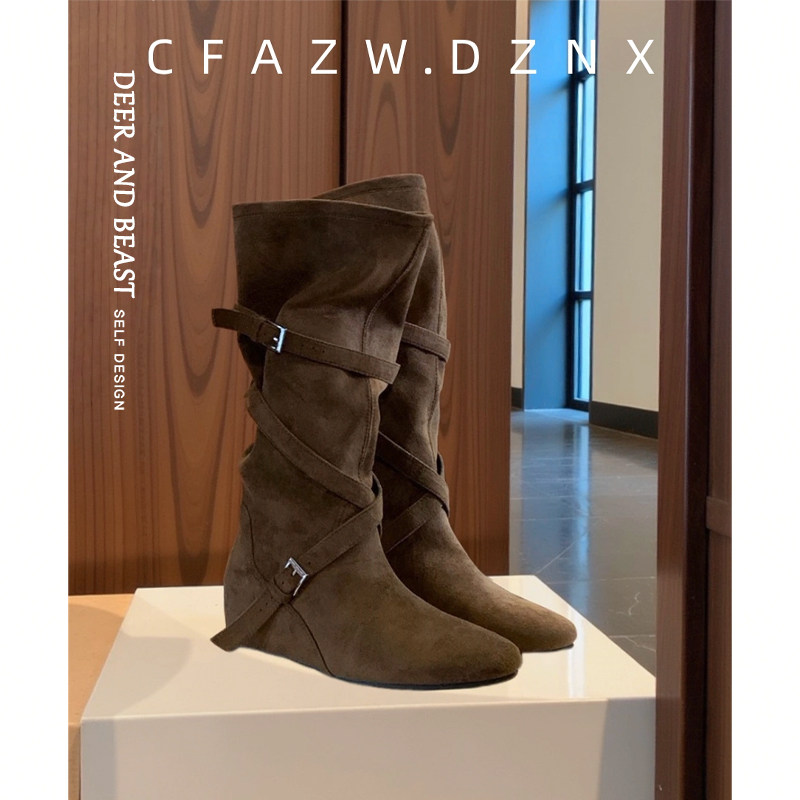 【折~】unfolio新款金属搭扣长筒堆堆靴麂皮圆头中筒靴两穿靴