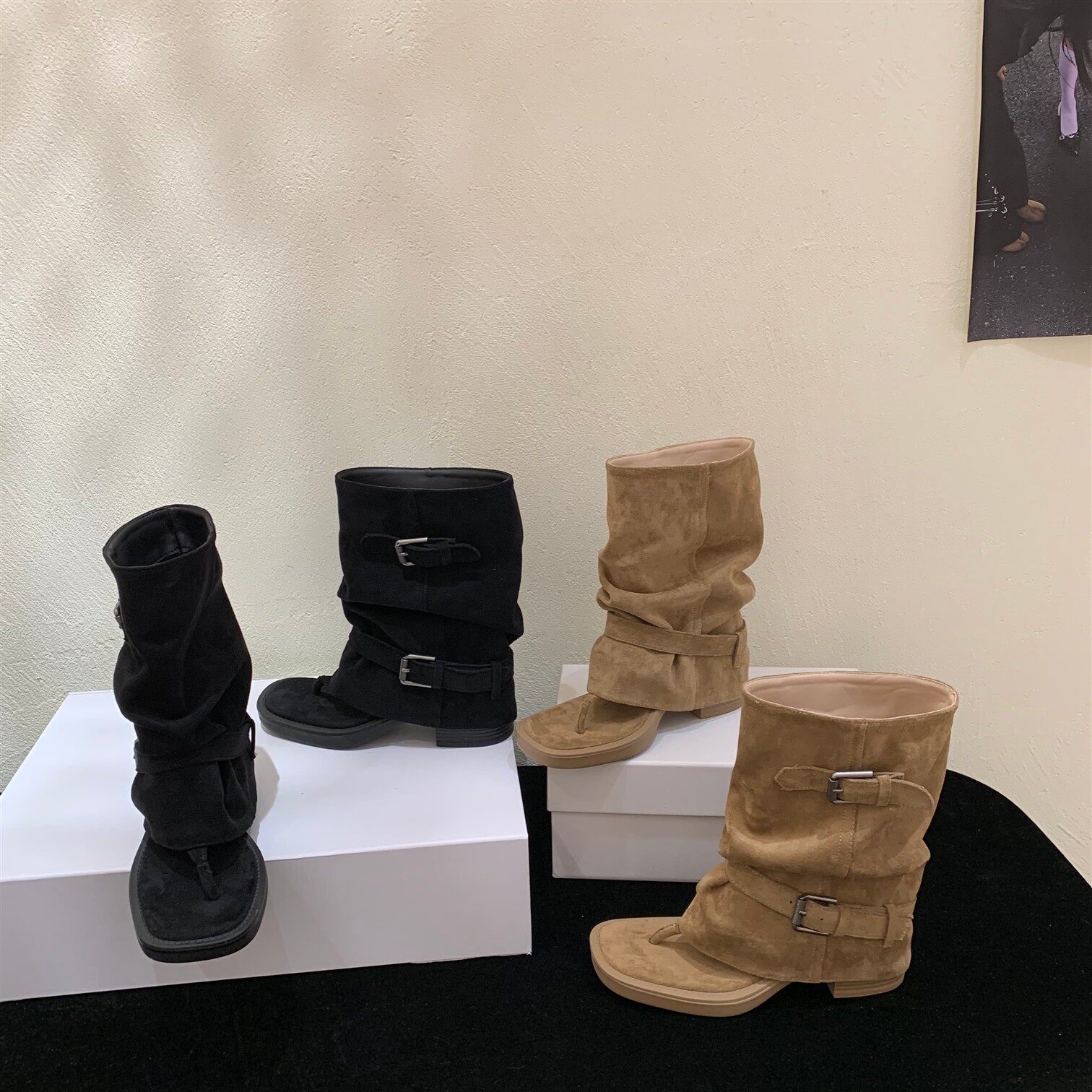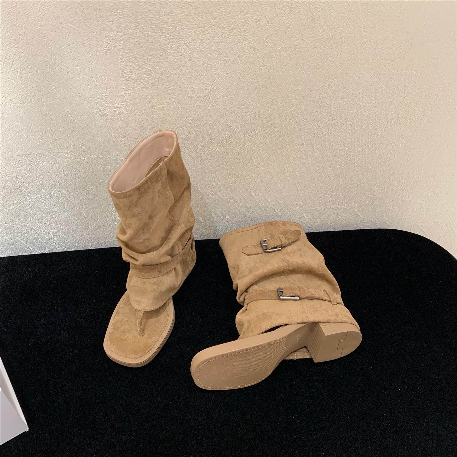 小池在首尔25年秋冬新款圆头方跟皮带扣骑士机车中筒绒面韩版女靴
