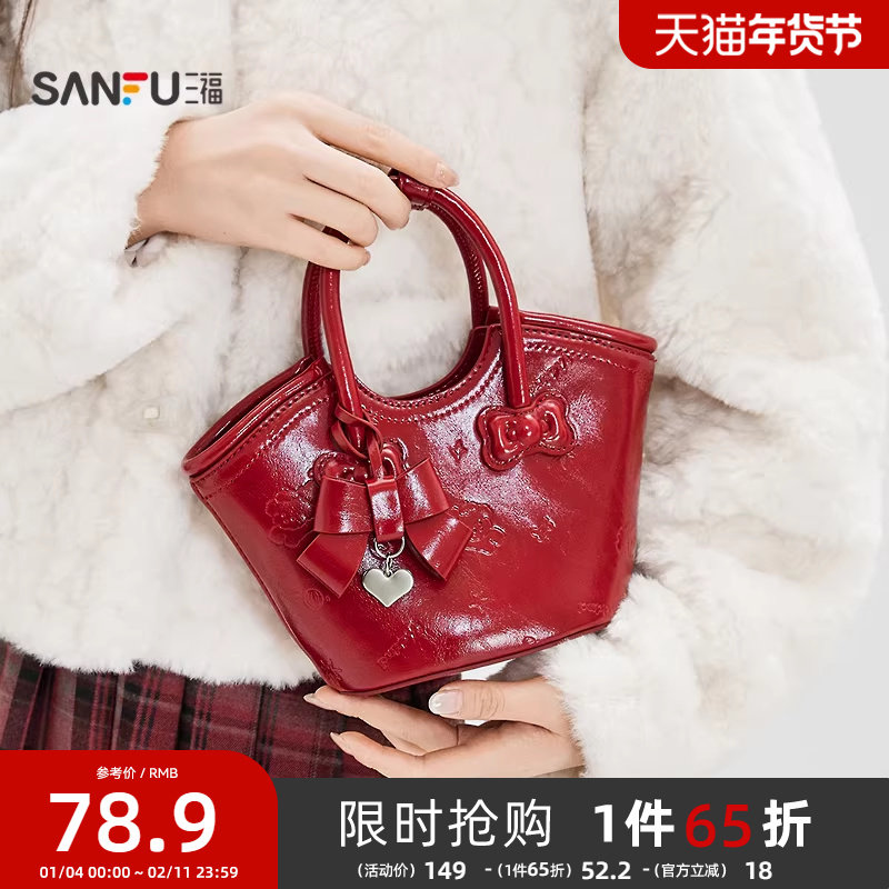 三福手提包冬季活力甜趣蝴蝶结纯色菜篮子水桶包女包510993