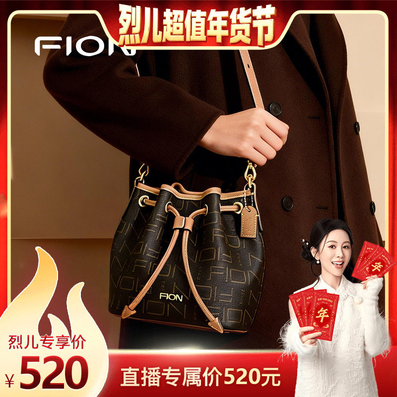 【烈儿超值年货节 】Fion/菲安妮抽绳水桶包女新款老花单肩斜挎包