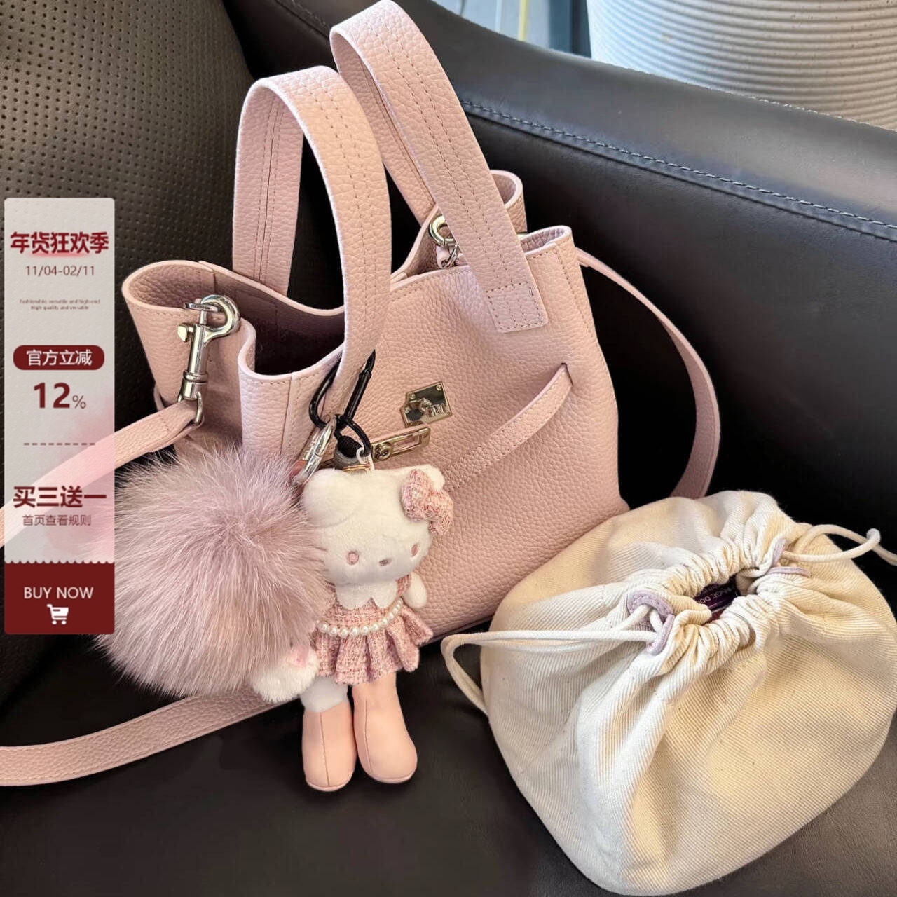 小众慵懒风粉色水桶包女真皮百搭手提菜篮子包秋冬新款单肩斜挎包