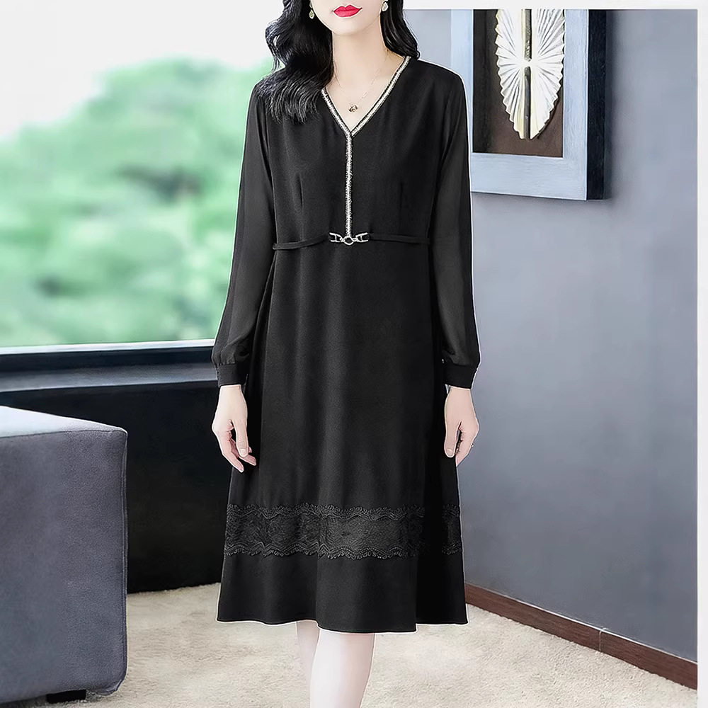 2025秋冬新款休闲V领长袖宽松大码雪纺连衣裙子胖妈妈中年女装