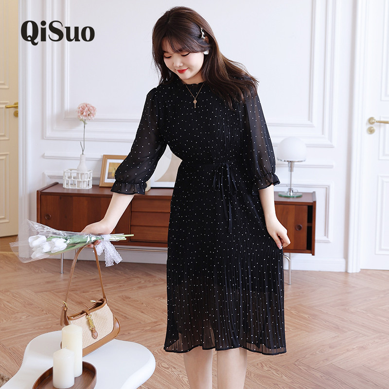 大码女装早秋连衣裙新款气质高级感收腰显瘦胖MM黑色雪纺波点长裙