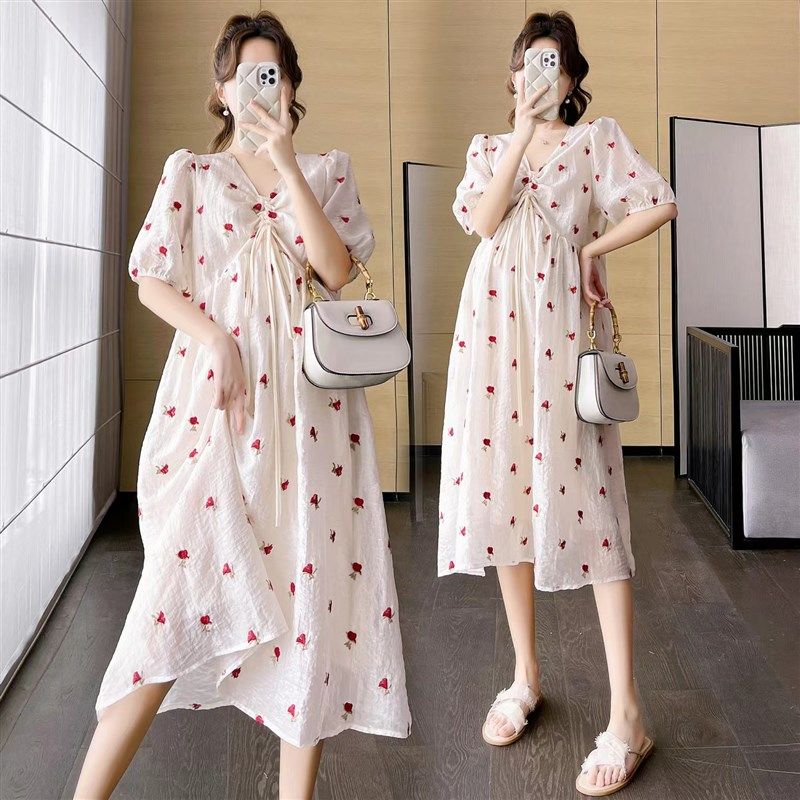 孕妇装法式新款连衣裙2023夏天抽绳V领刺绣中长款大码雪纺连衣裙