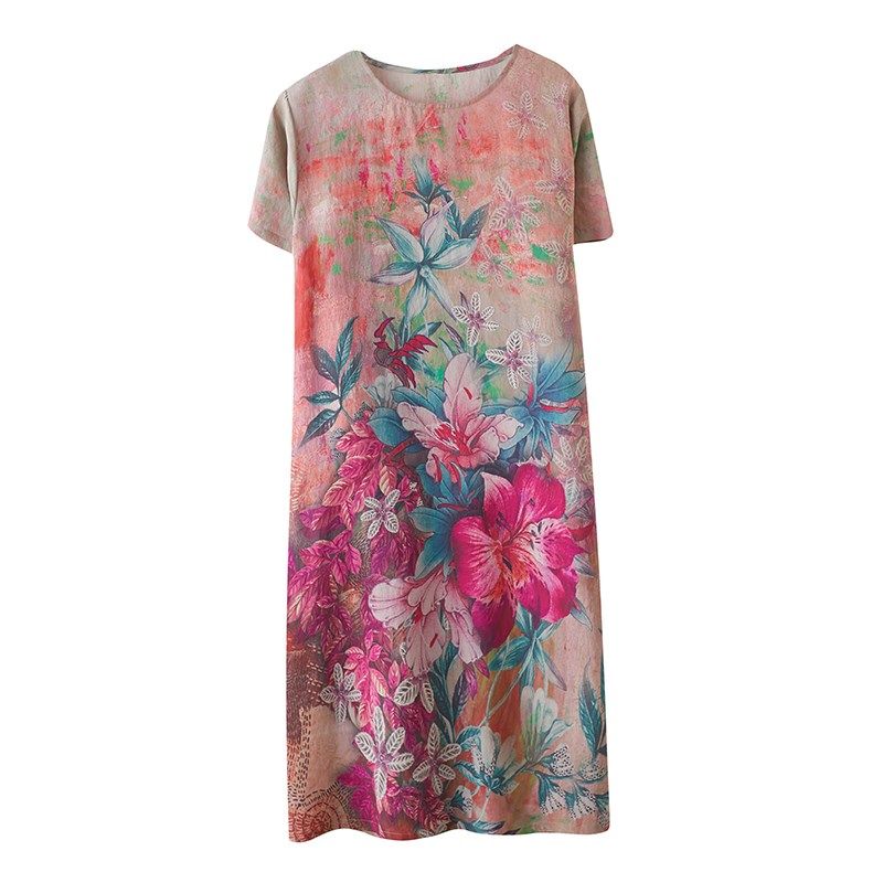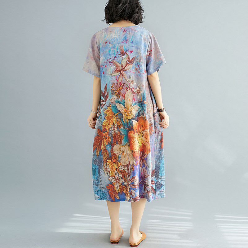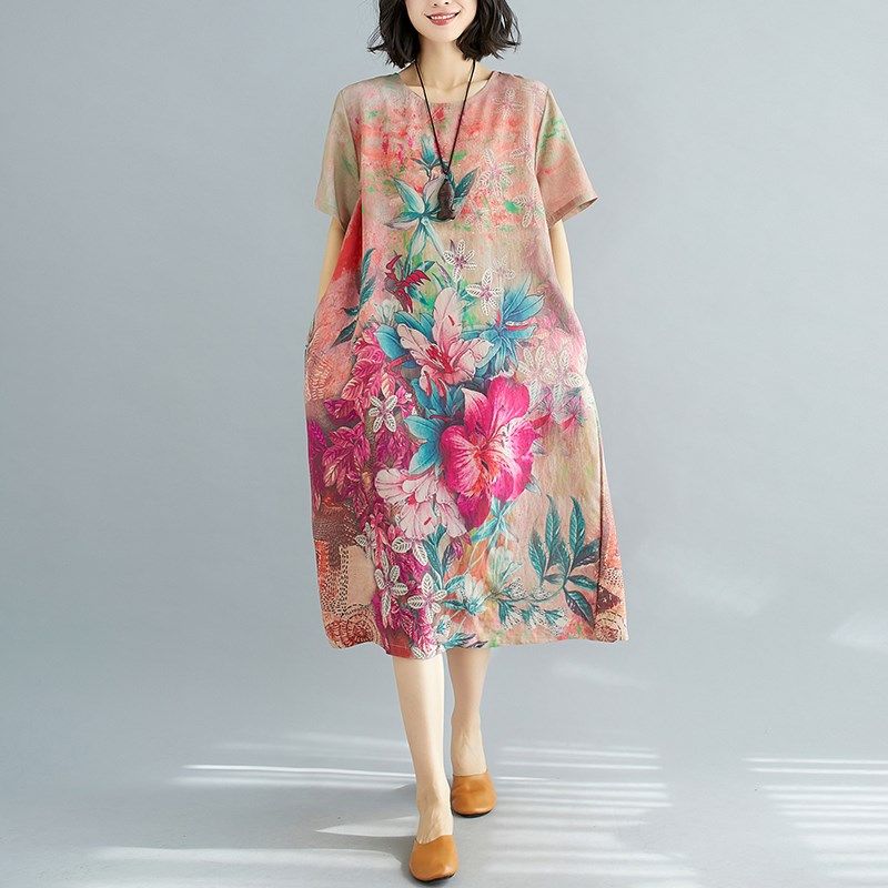 大码女装连衣裙夏季雪纺复古显瘦印花衬衫裙胖mm收腰宽松遮肉裙子