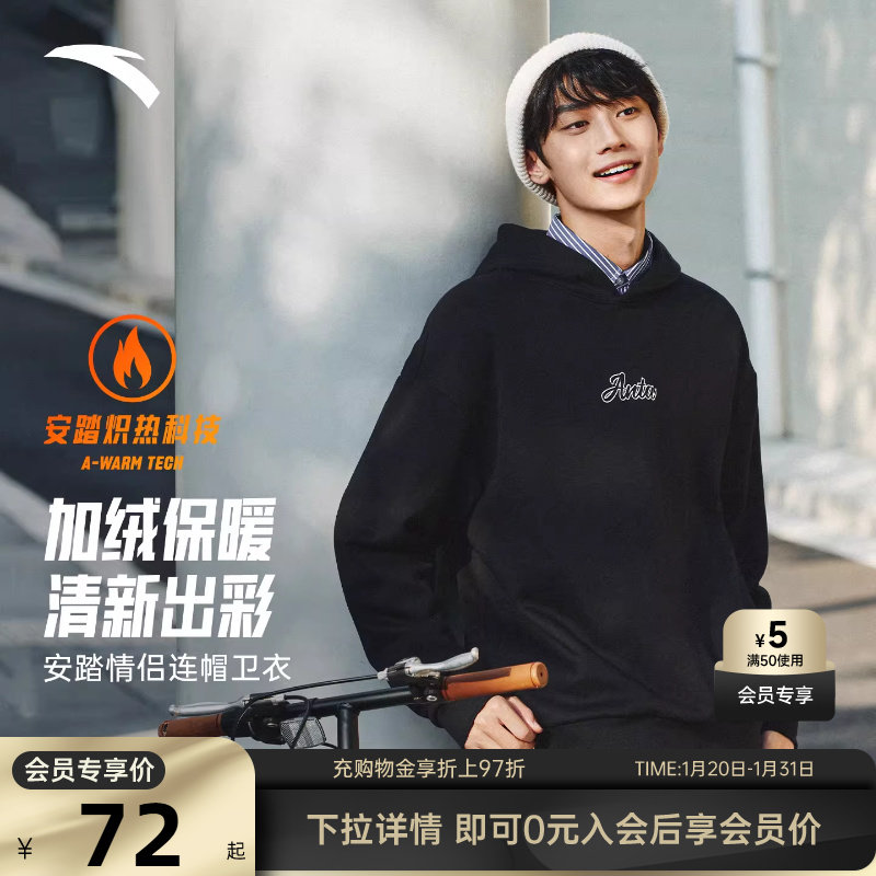安踏连帽加绒卫衣男女同款冬季新款情侣休闲潮流套头长袖针织上衣
