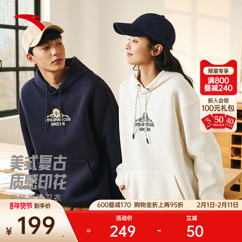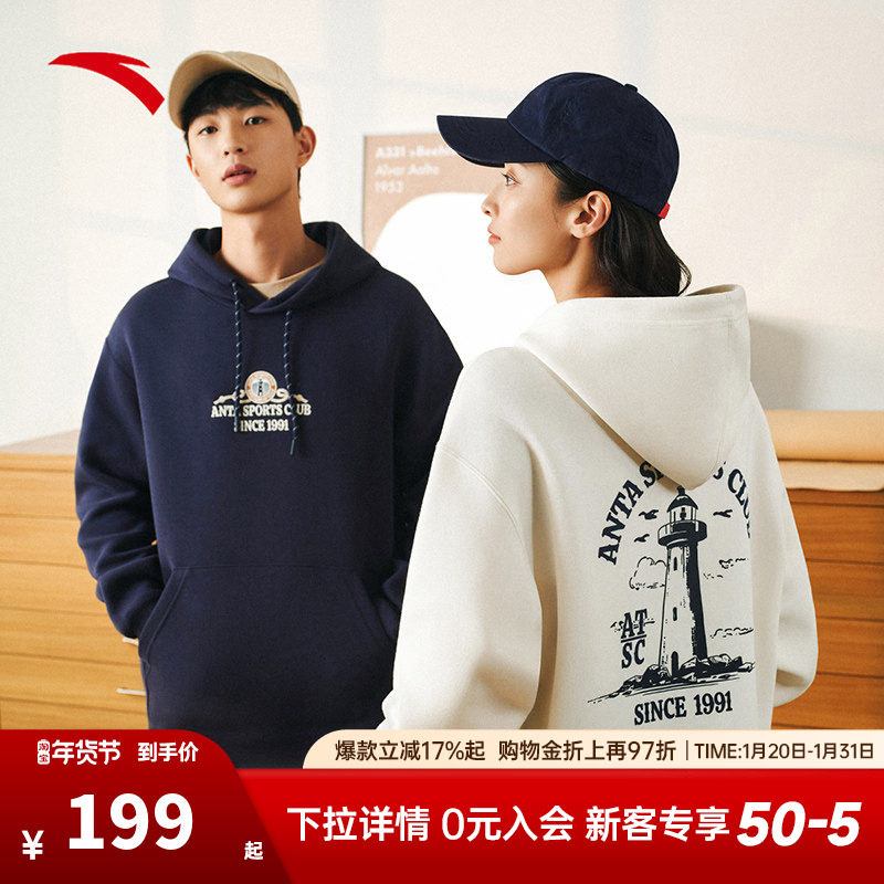 安踏情侣款连帽长袖卫衣男女冬季新款潮流休闲套头衫宽松运动上衣