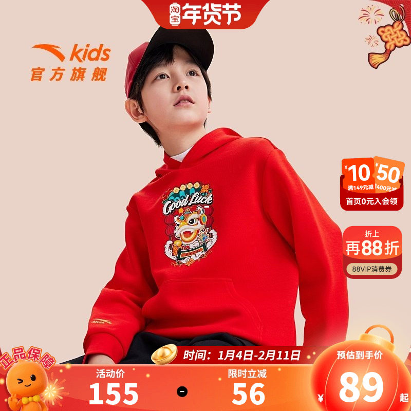 安踏儿童卫衣男童大小童装2026新年款春季马年保暖喜庆连帽套头衫