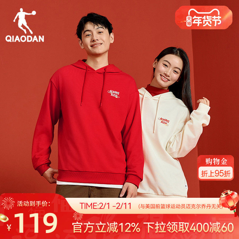 乔丹红色卫衣男女冬季新款连帽新年宽松本命年上衣情侣加绒套头衫