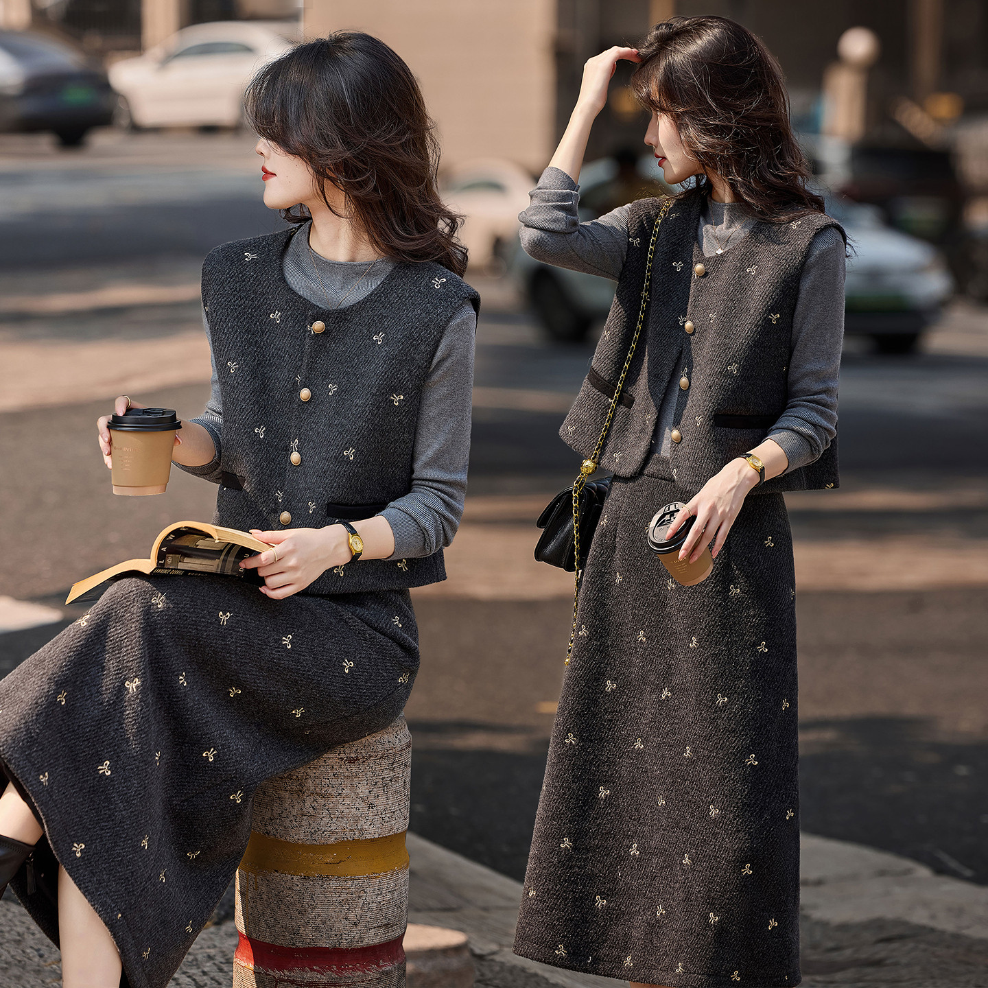苏醒的乐园蝴蝶结刺绣含绵羊毛马甲半裙套装2025年冬季女三件套