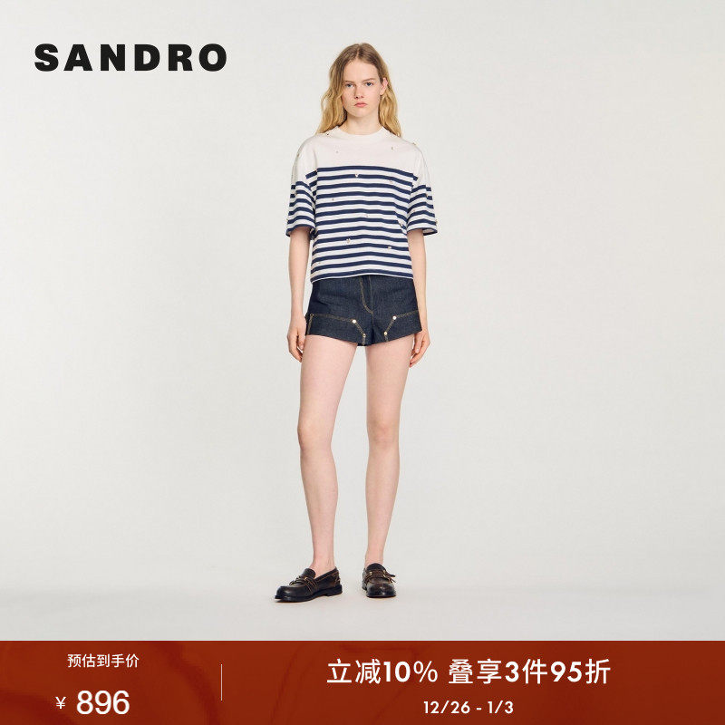 SANDRO Outlets秋冬女装法式优雅棉质撞色横条纹仿钻短款短袖T恤