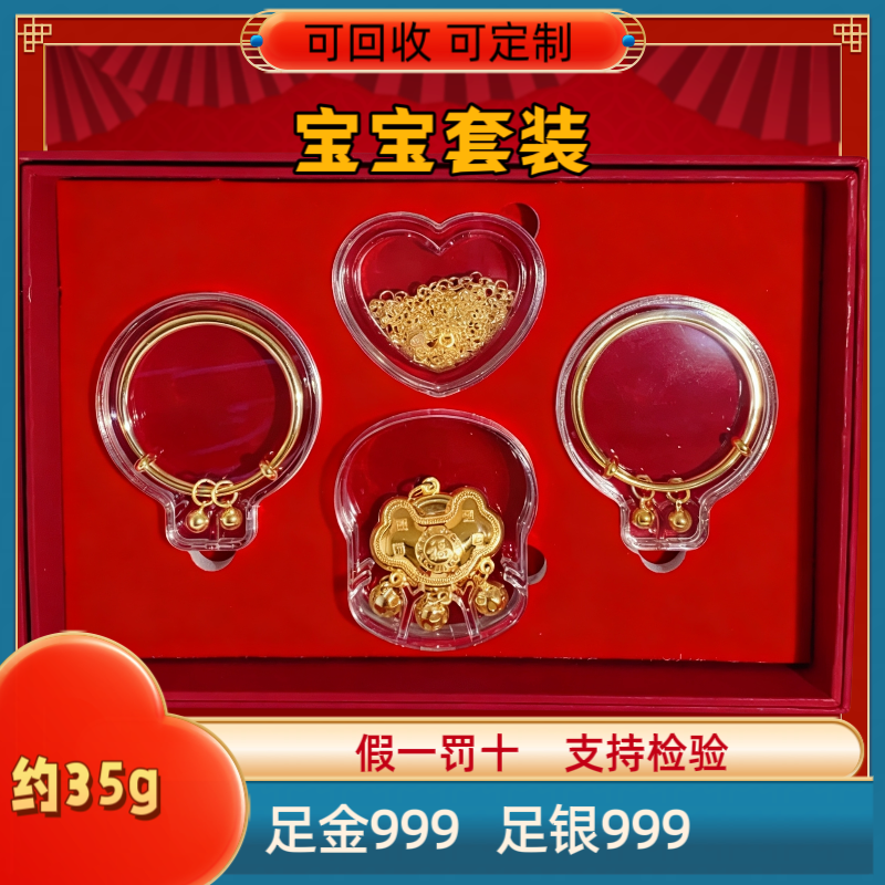 9999足银宝宝银饰礼盒套装平安锁手镯福字长命锁婴儿满月生日礼物
