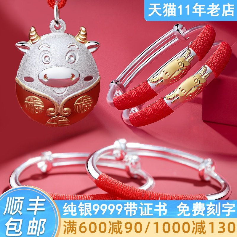 顺庆银楼足银999小马宝宝套装宝宝红绳编织足银手镯满月周岁礼物