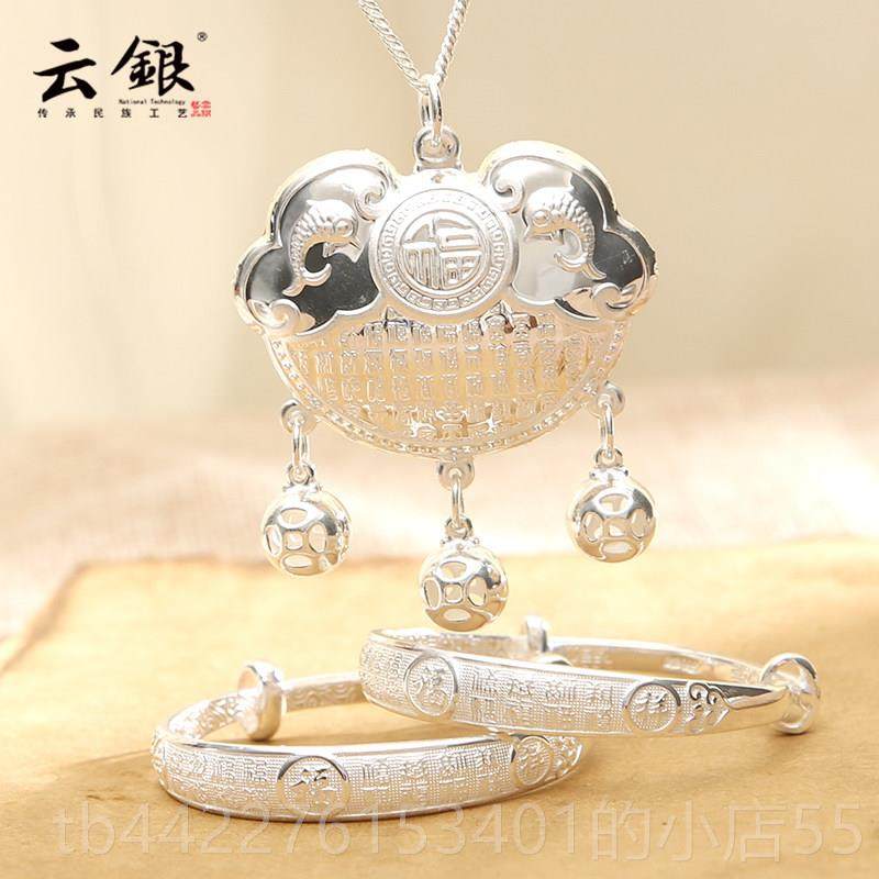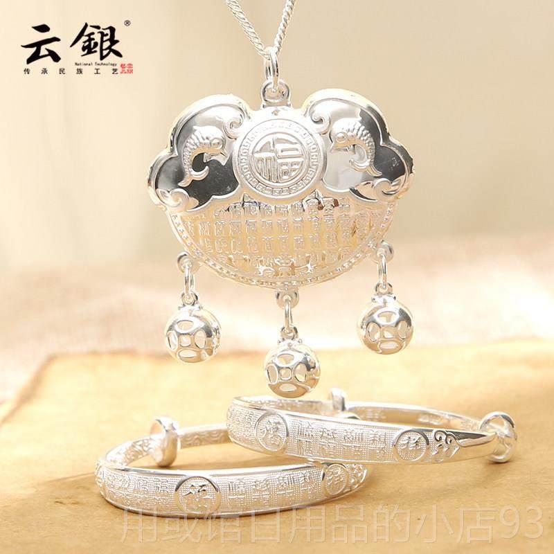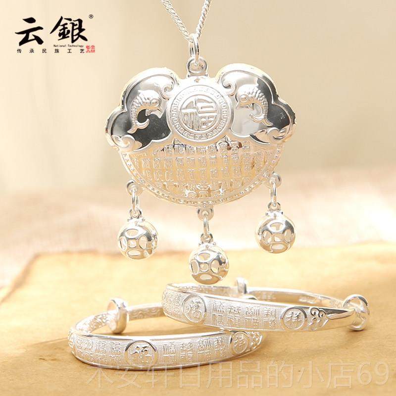 正品云银宝宝银手镯周999纯长命锁镯三件套装百福婴银子儿满月岁