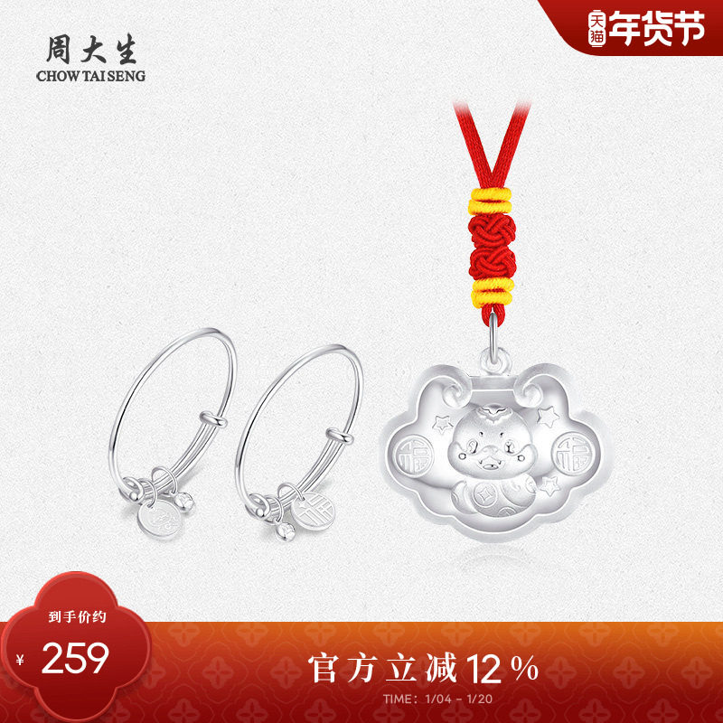 周大生足银S990宝宝套装礼盒幸福如意锁手镯一对送周岁满月礼物