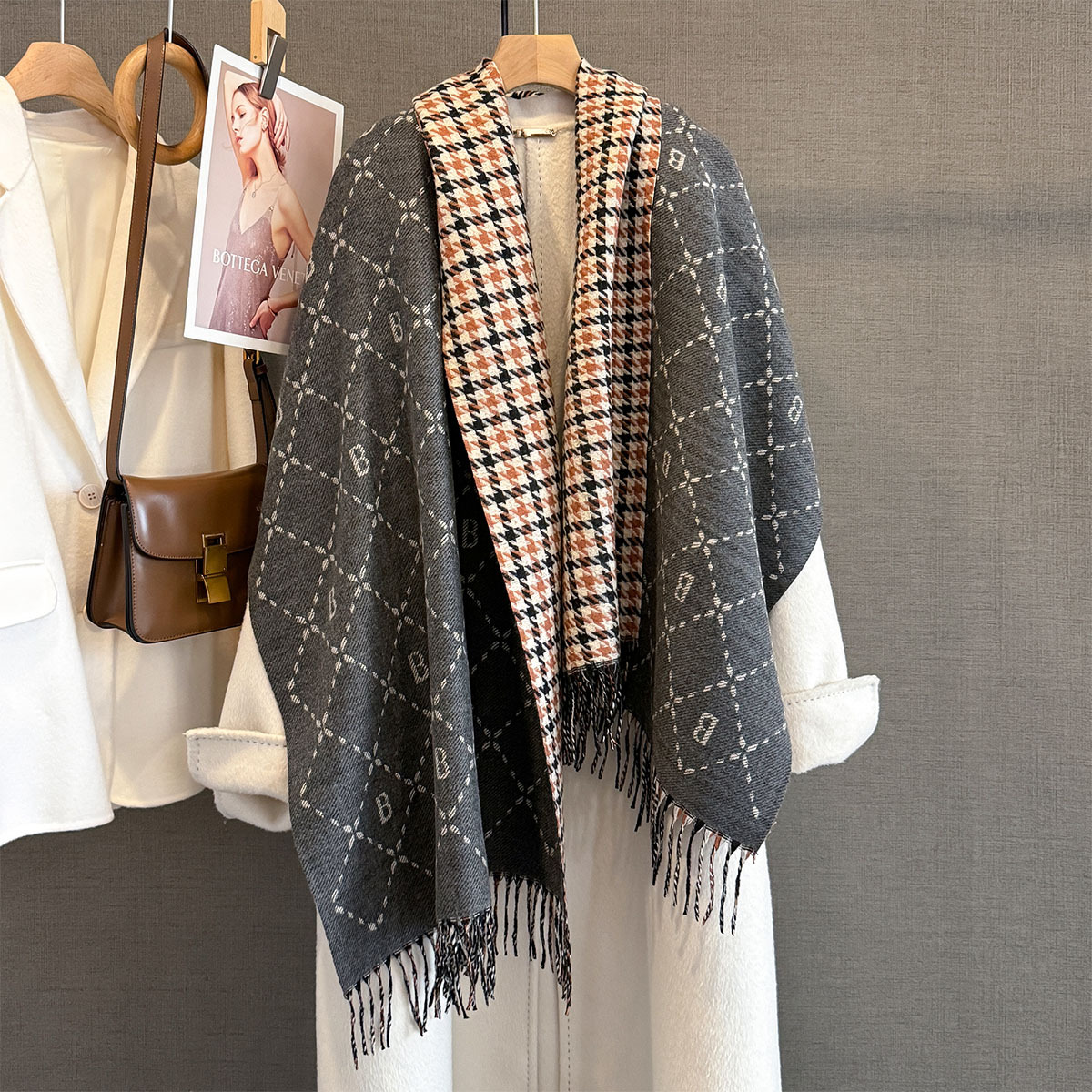 秋冬仿羊绒披肩保暖针织围巾女士韩版时尚百搭格子围脖B03153