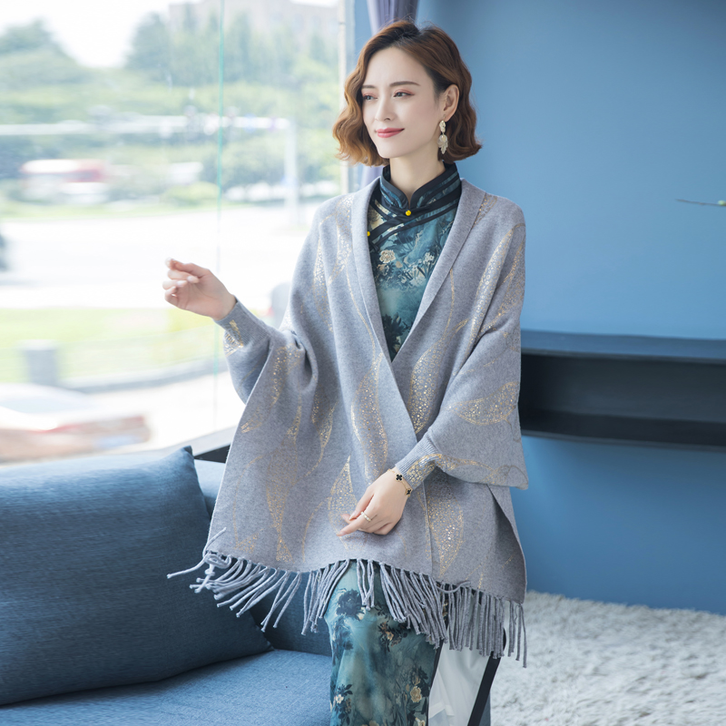 喜婆婆妈b妈配旗袍披肩春秋羊绒气质带袖外搭礼服婚庆斗篷披风外
