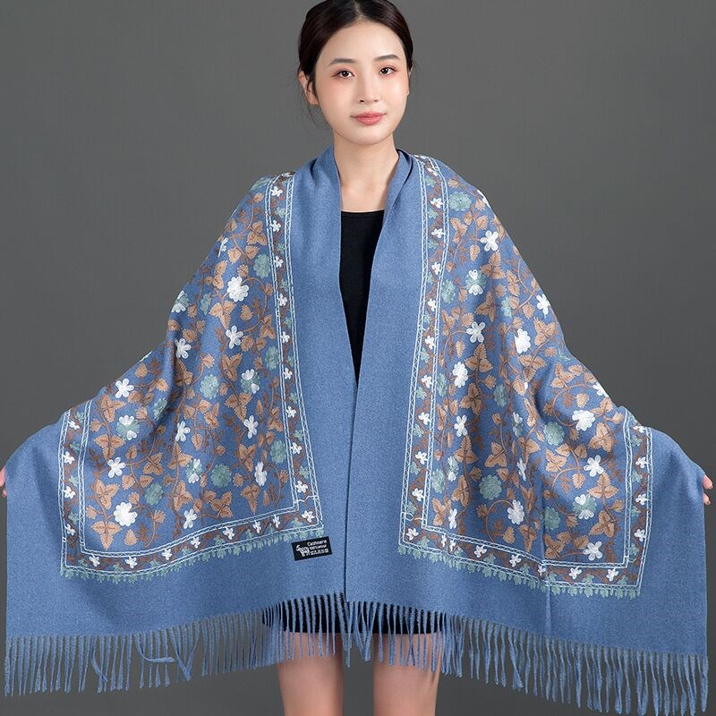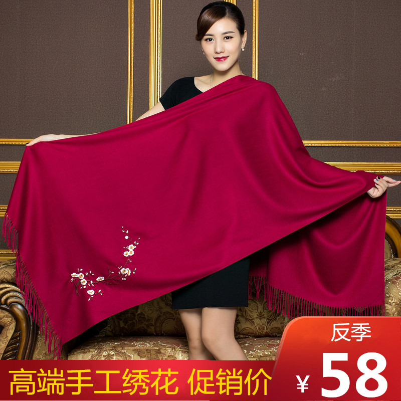 中国红色刺绣仿羊毛羊绒围巾女秋B冬旗袍空调披肩夏外搭多用妈妈