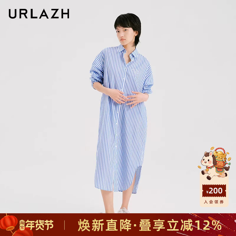 URLAZH有兰新款复古洋气纯棉气质宽松蓝色条纹长袖连衣裙长款女