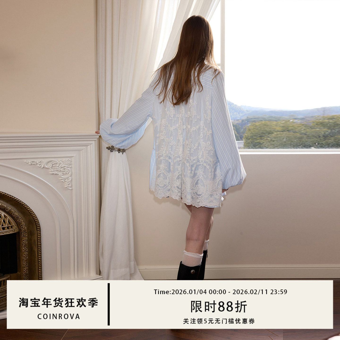 COINROVA 蓝色条纹蕾丝拼接衬衫裙荷叶边灯笼袖长袖连衣裙短款