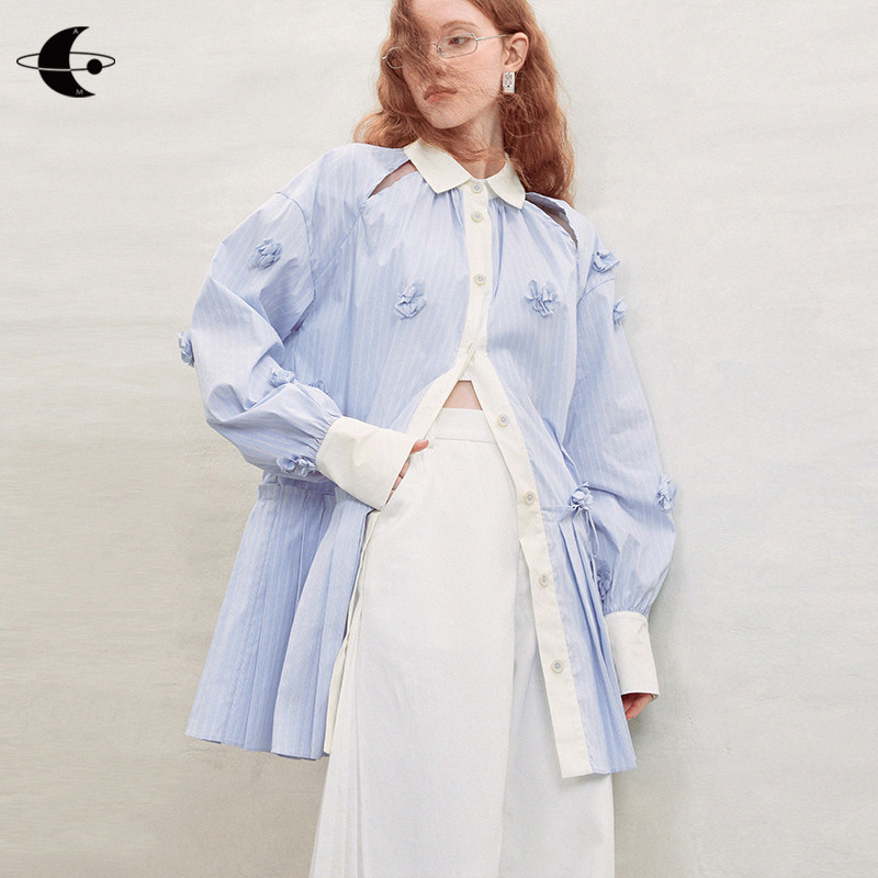 创世纪元【花影流光】miu里miu气蓝白条纹长袖连衣裙法式衬衫裙子