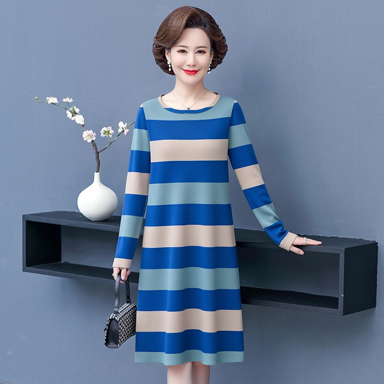 网红爆款高档条纹长袖连衣裙女中长款显瘦减龄大码妈妈装蓝色裙子