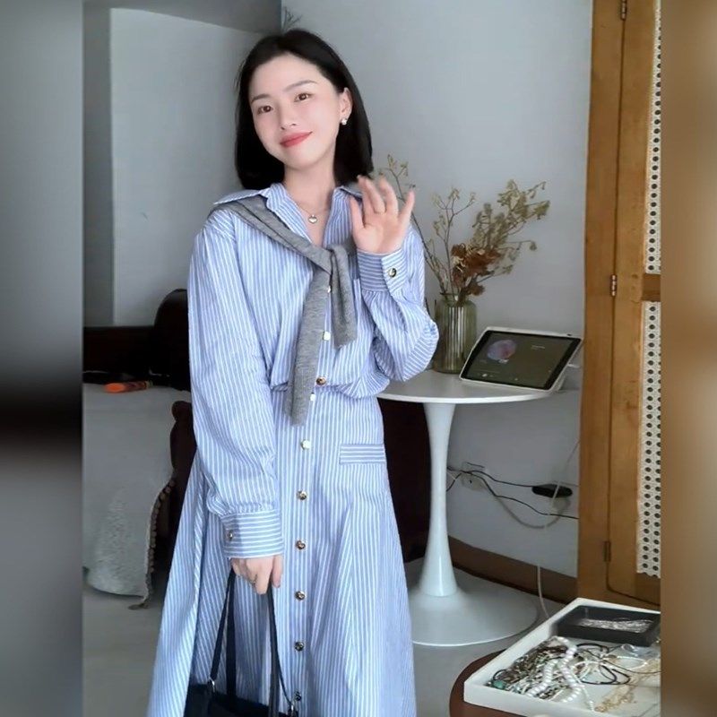 新款蓝色条纹长袖衬衫连衣裙女中长款2025法式设计感修身裙子6615