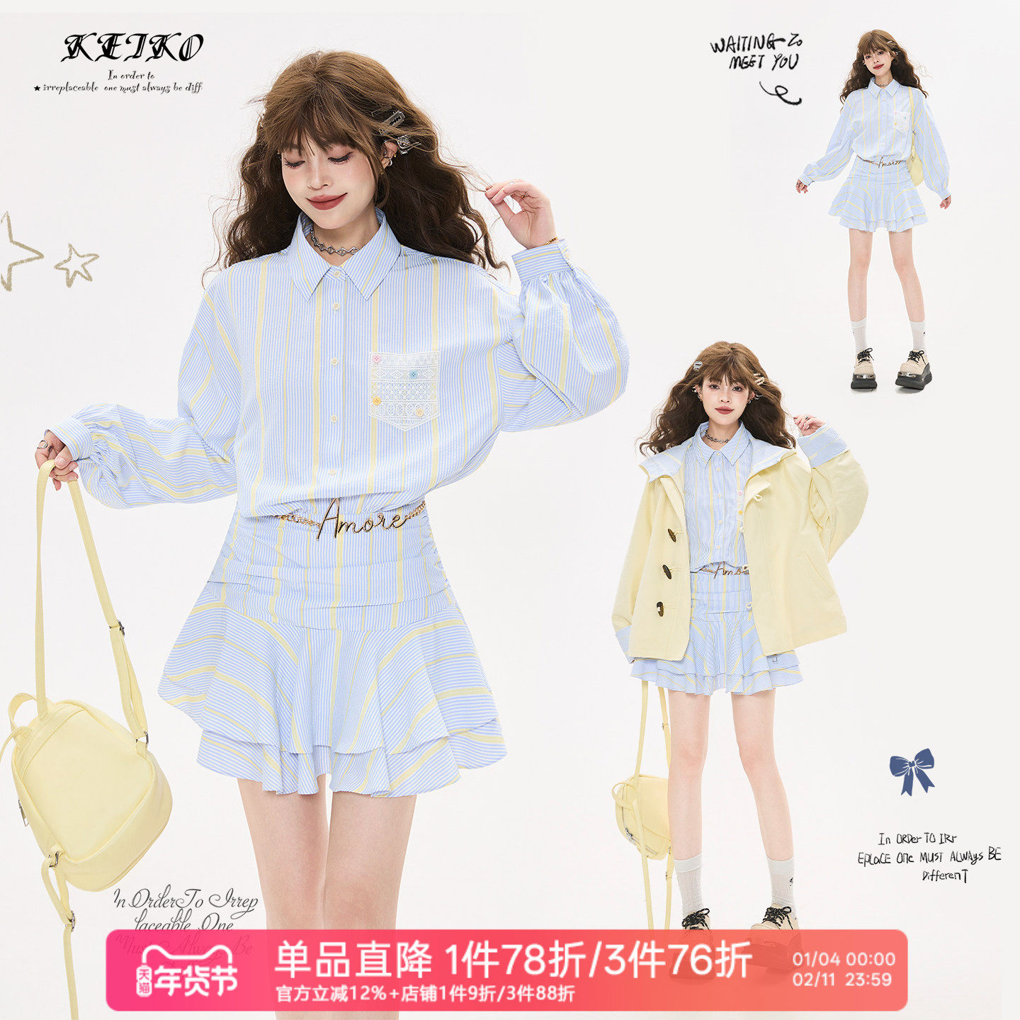 KEIKO 轻淑感浅蓝色条纹长袖连衣裙春季漂亮冷淡系小个子衬衫裙子