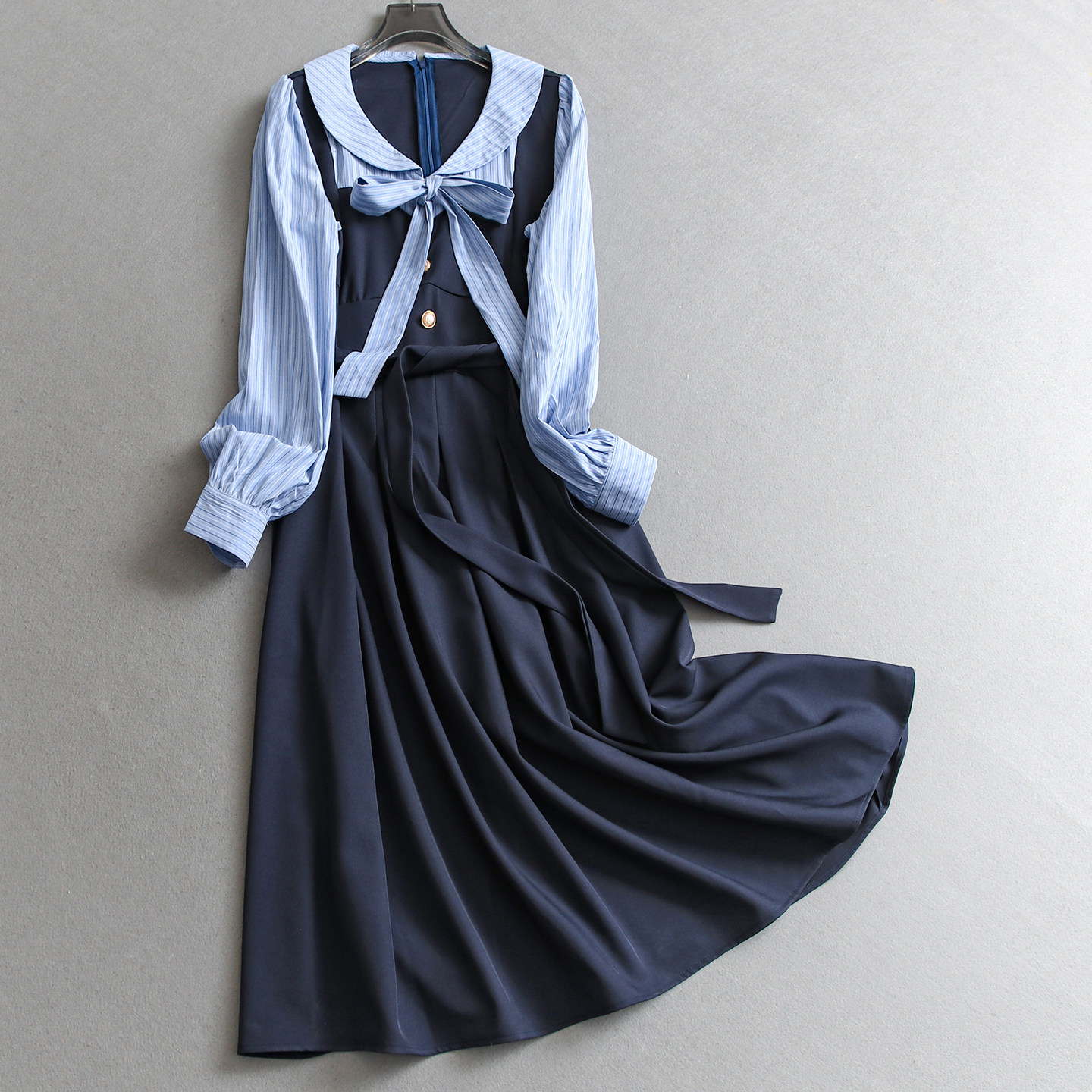 蓝色条纹假两件显瘦修身蝴蝶结飘带收腰a字裙长袖女裙连衣裙W010