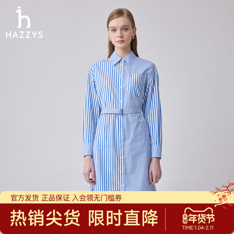 Hazzys哈吉斯简约潮流时尚通勤休闲条纹长袖连衣裙蓝色宽松裙子女