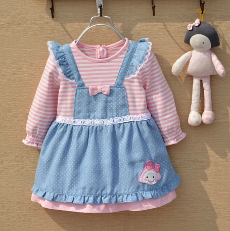 幼小童韩版童装 儿童裙子 女童粉条纹蓝围裙款长袖连衣裙1-2岁