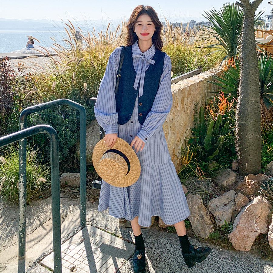 蓝色长袖条纹连衣裙两件套女2025春秋新款马甲宽松长款衬衫裙套装