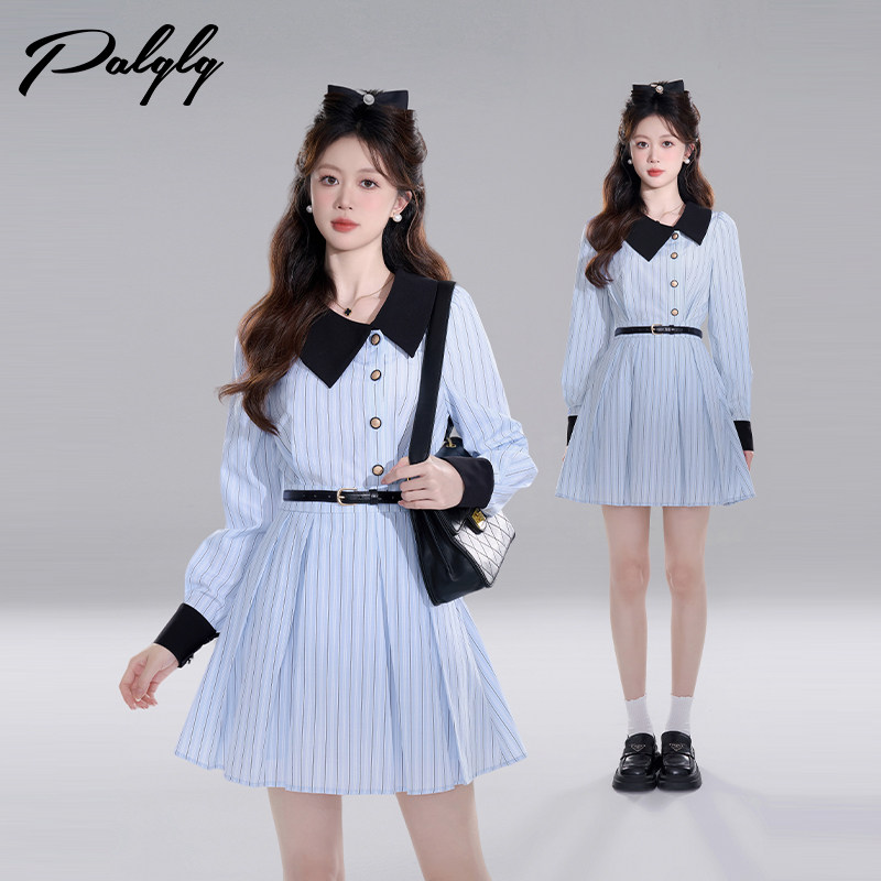 学院风浅蓝色长袖条纹衬衫连衣裙女收腰气质设计感polo领百褶短裙