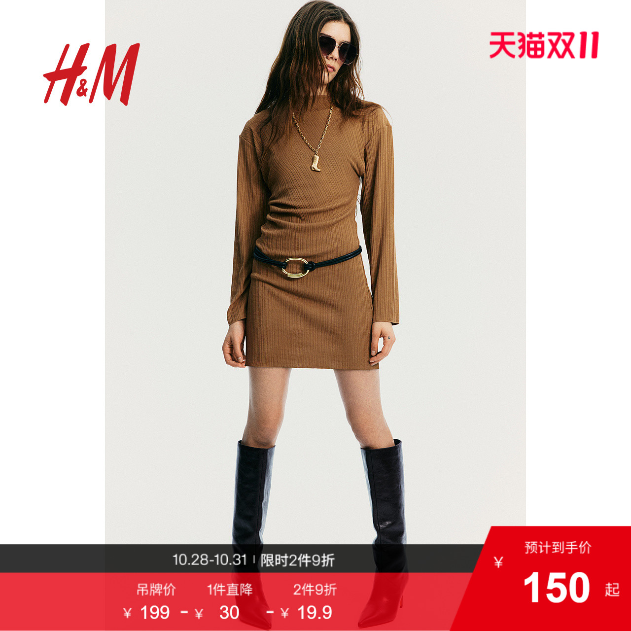 HM女装连衣裙2025秋季新款一字领长袖垂褶紧身收腰短裙1264597