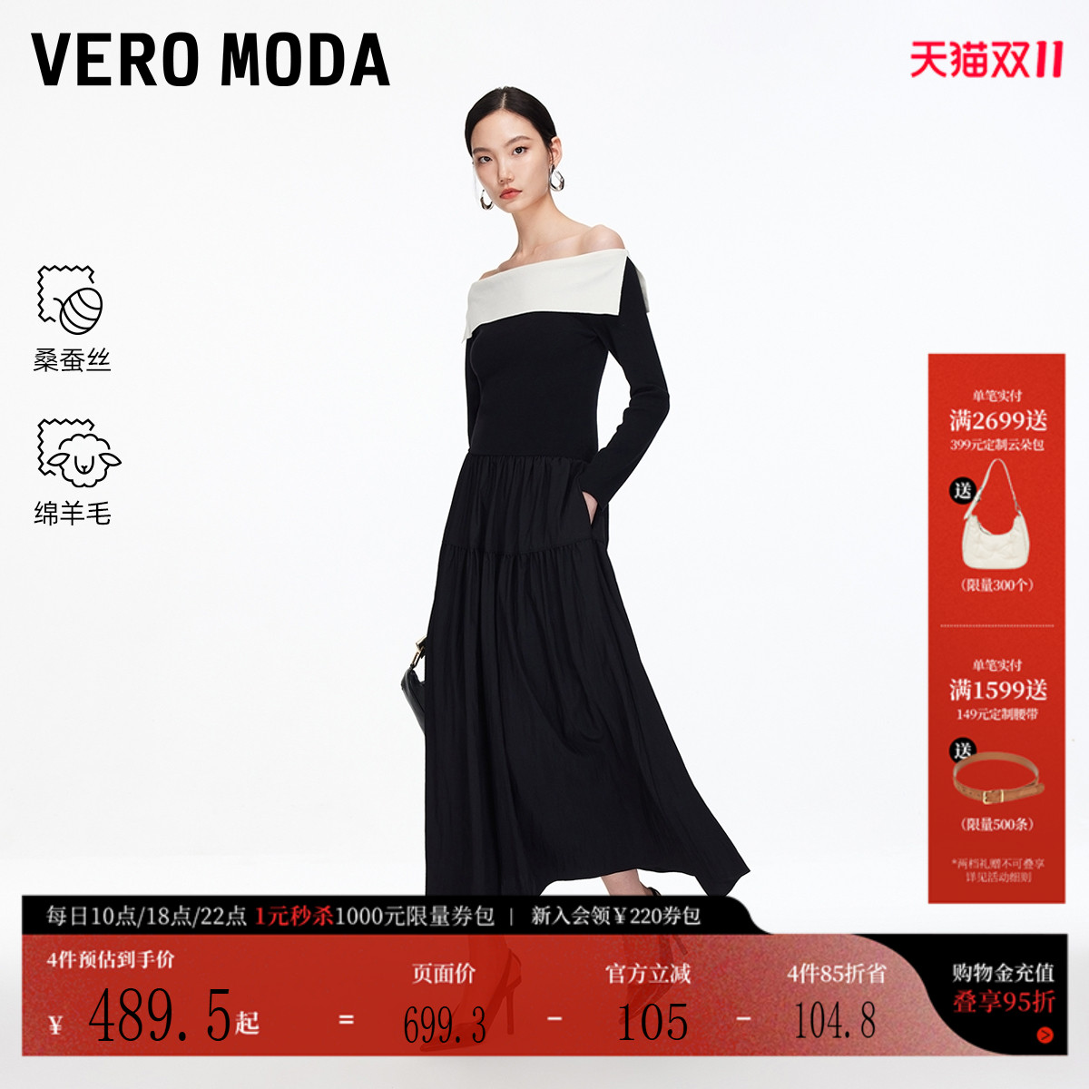 Vero Moda连衣裙25秋季含羊毛桑蚕丝撞色一字领轻熟法式32537C006