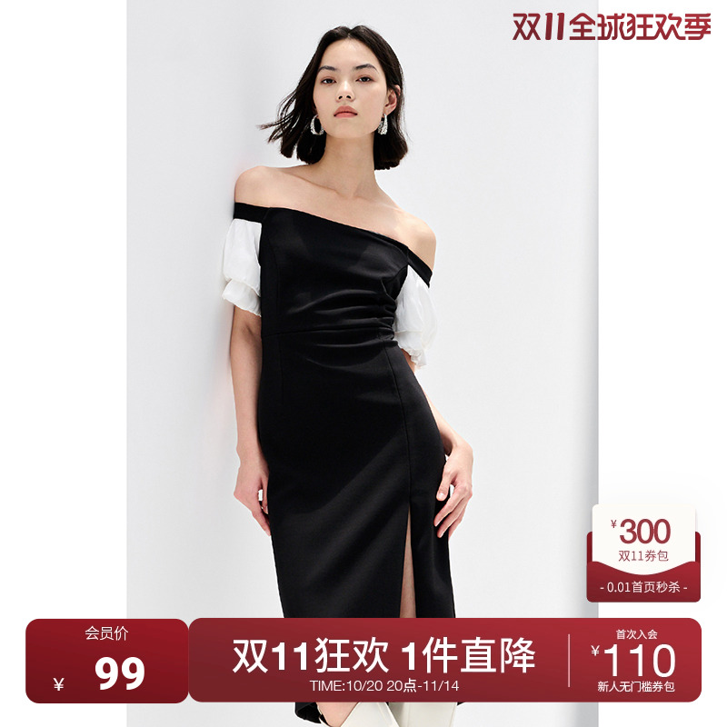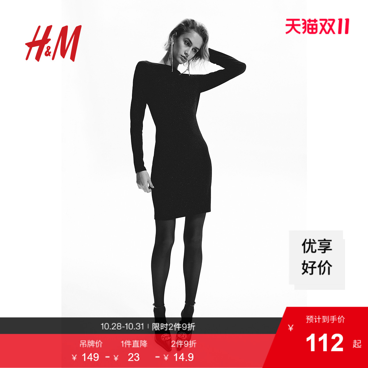 HM女装连衣裙秋季一字领修身显瘦气质法式礼服长袖长裙1249589