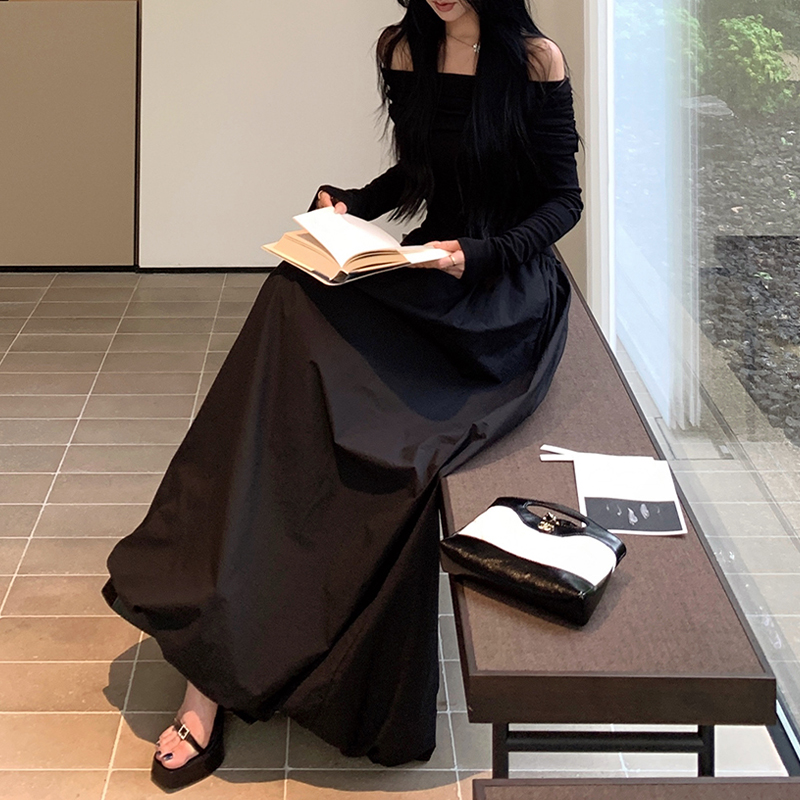 alex stevens一字领斜肩露肩连衣裙女长袖a字裙黑色长裙子针织秋