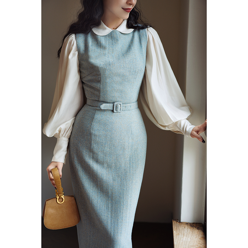 NEVA HU 两穿一字肩荡领连衣裙女复古优雅无袖背心裙后开叉裙子